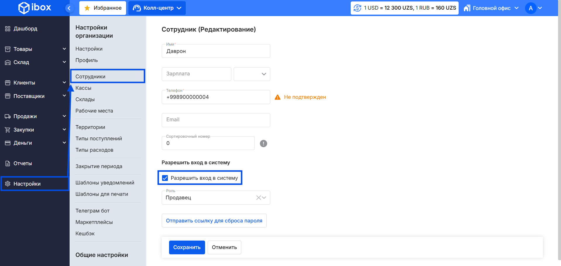 - Отключить вход — если сотрудник остаётся в штате, но не должен заходить в систему (например, доставщик).