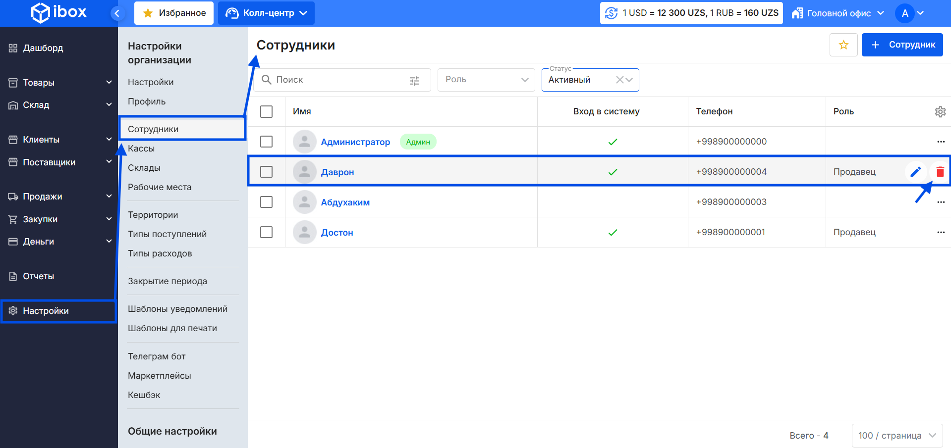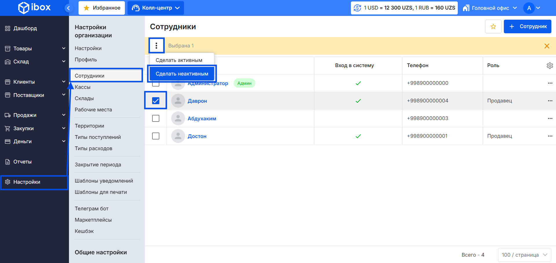 - Деактивировать сотрудника — если он уволен и больше не должен участвовать в операциях.