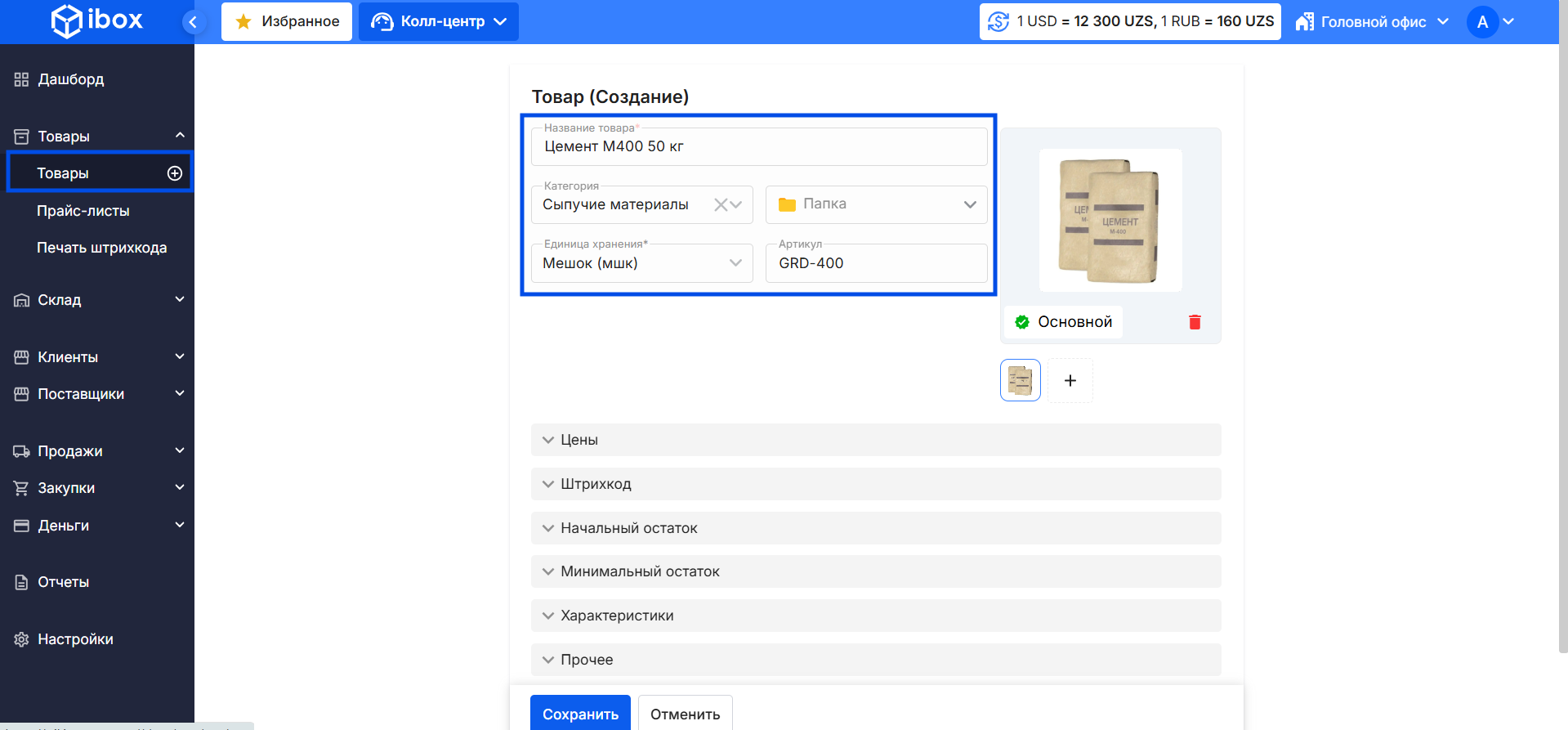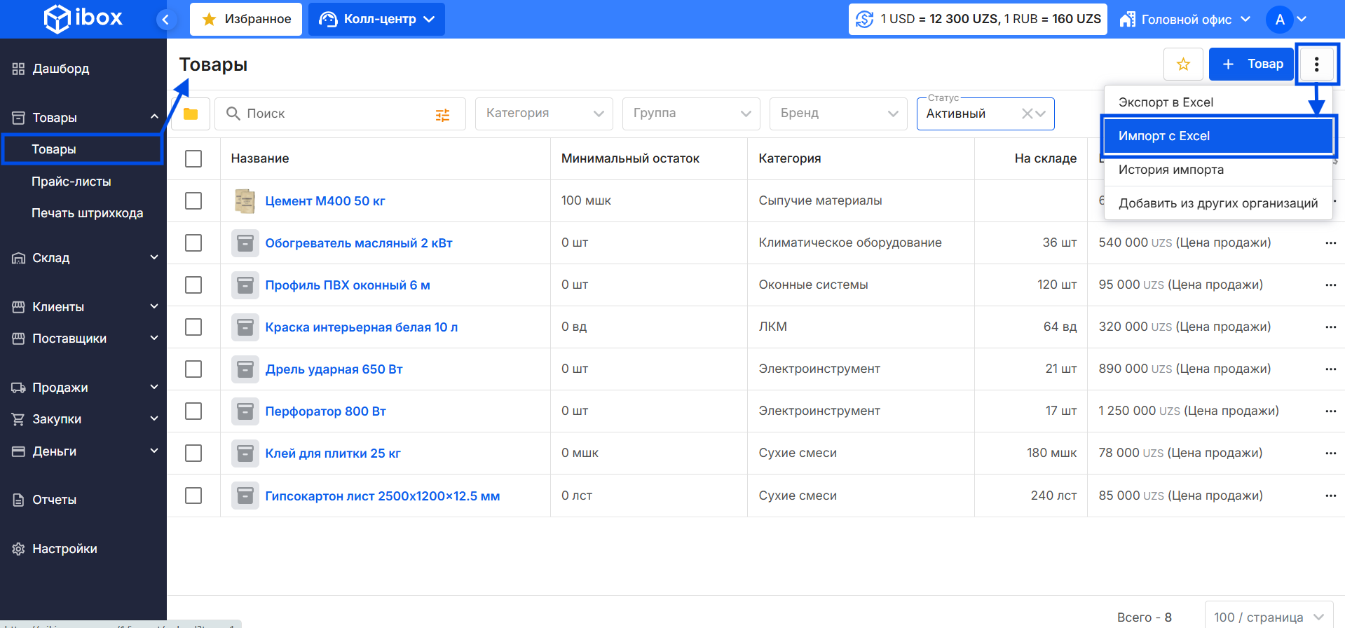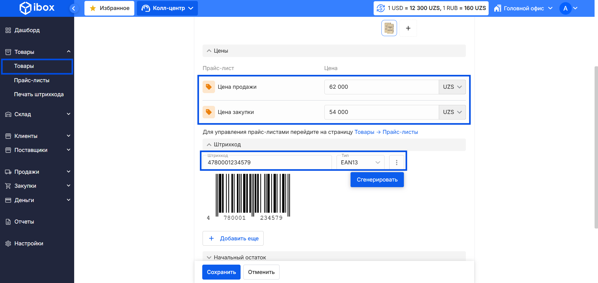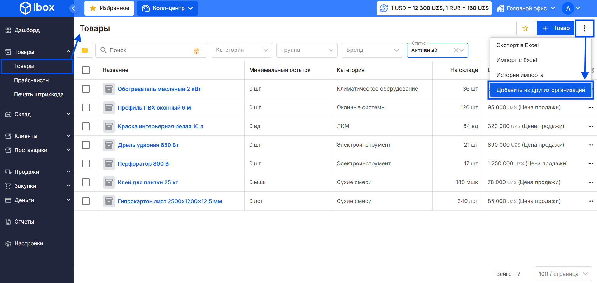 - Перейдите в раздел Товары из бокового меню.