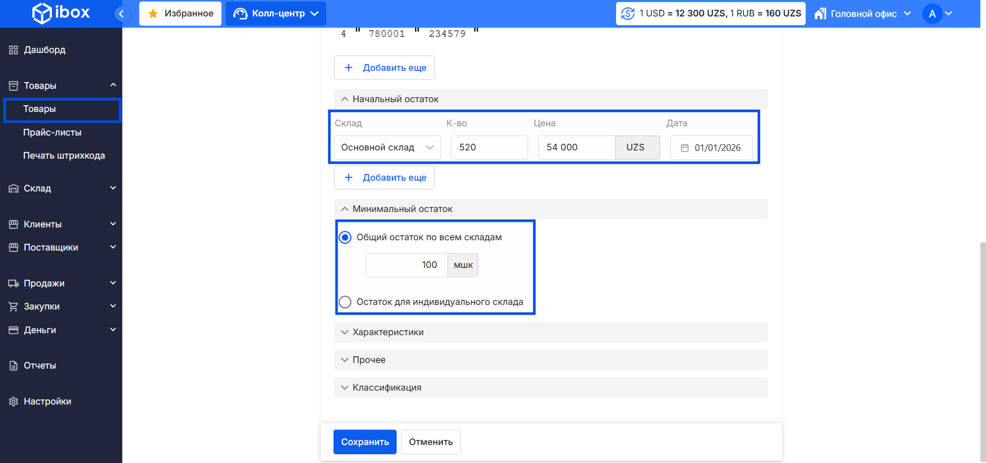 - Откройте вкладку Минимальный остаток и укажите его по каждому складу или по общему остатку.
