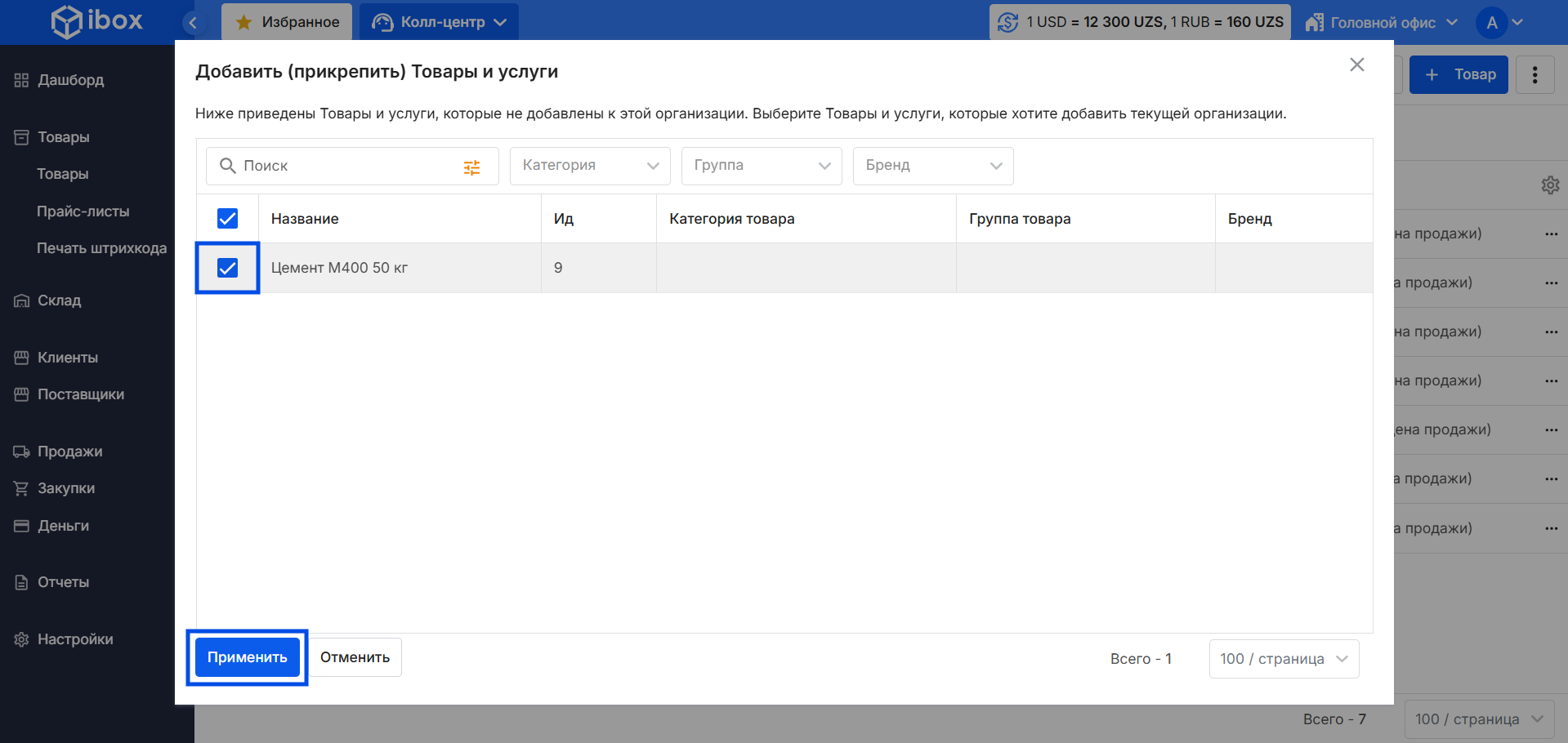 - В окне Добавить (прикрепить) товары и услуги выберите нужные товары.