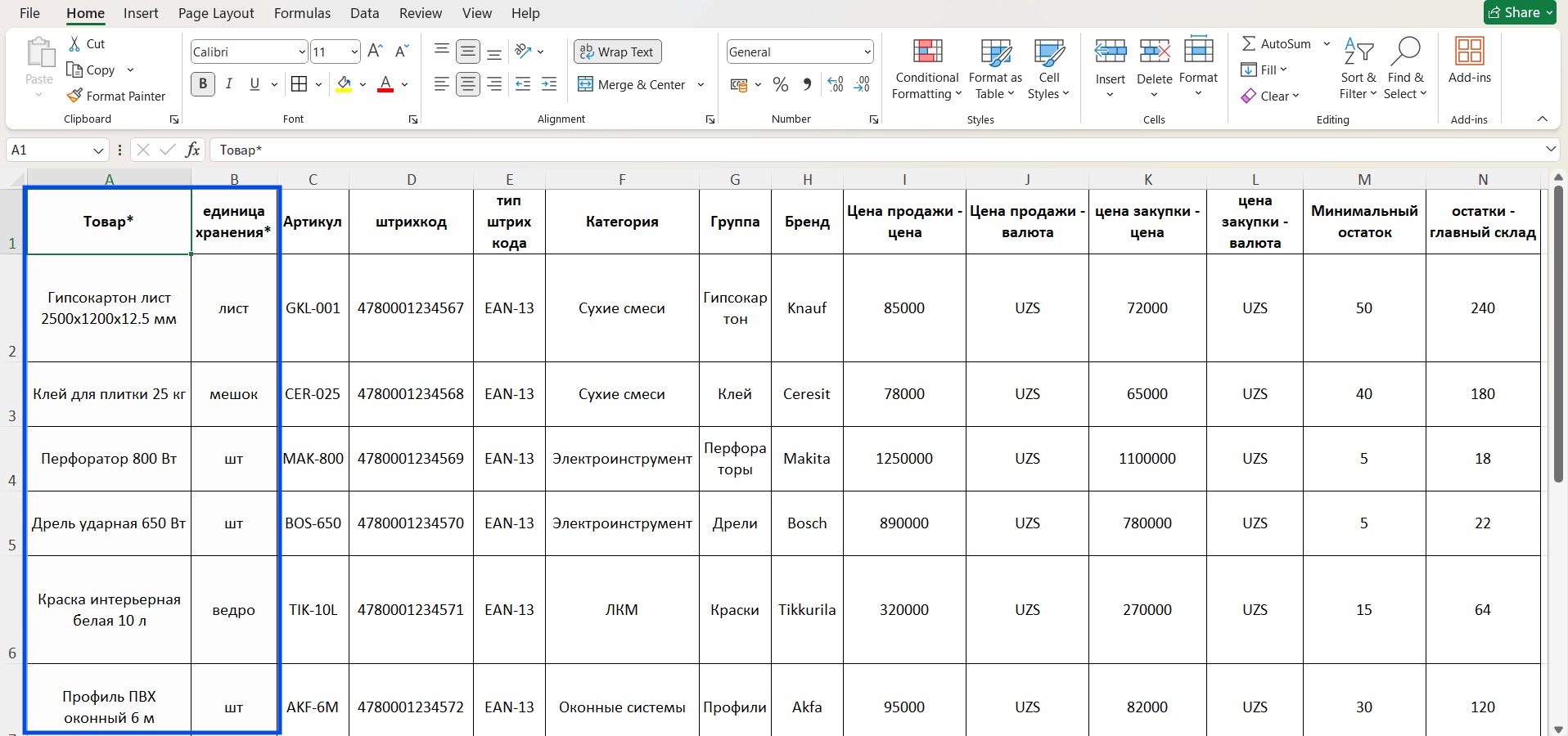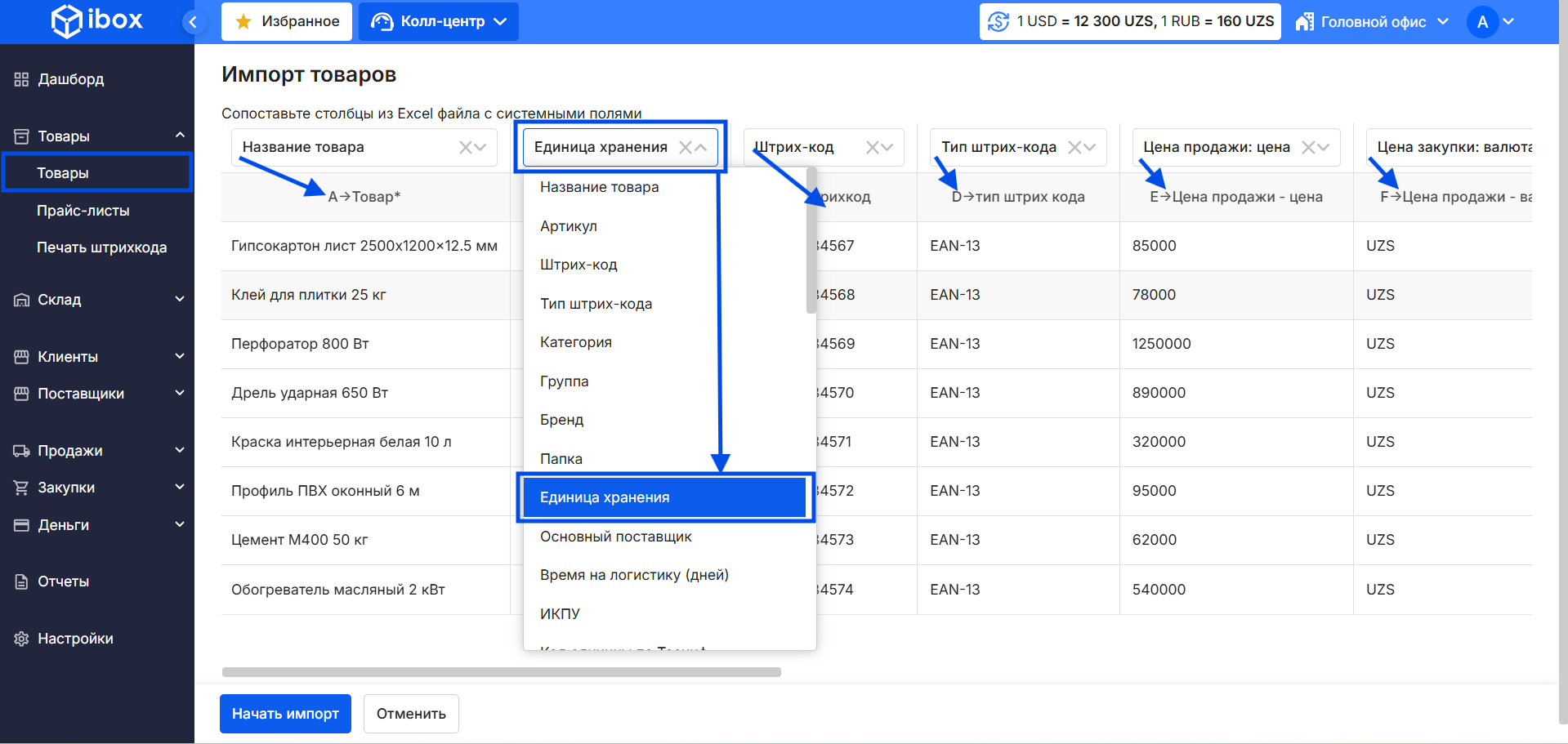 Категории, группы, бренды и валюты в Excel должны совпадать с данными в системе.