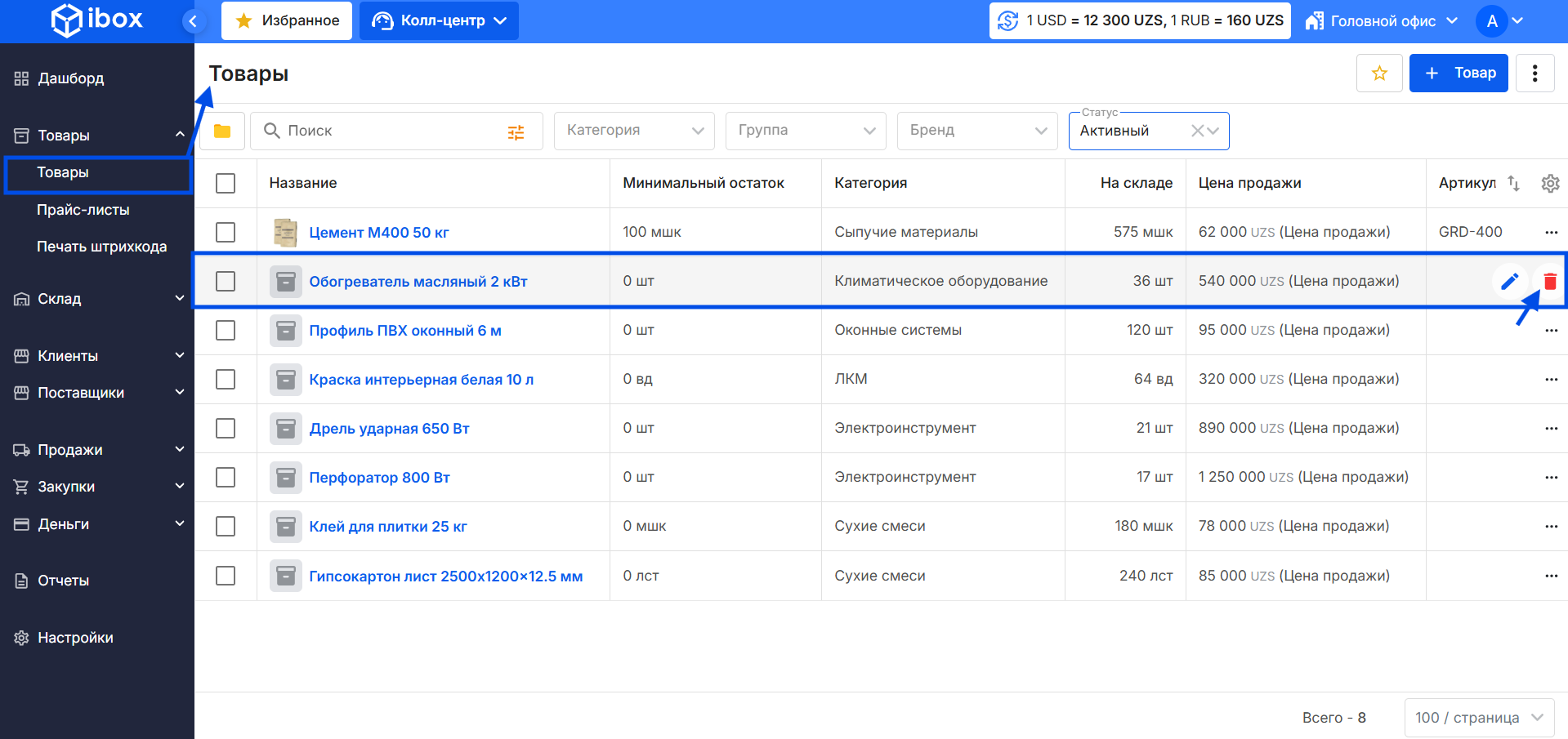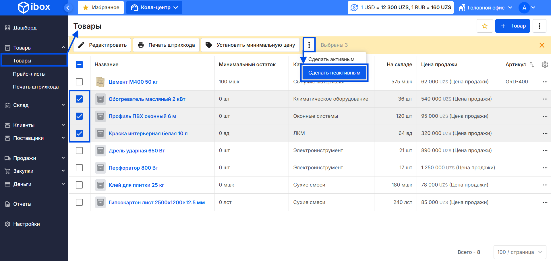 В iBox есть два основных способа убрать товар из работы: удалить его или деактивировать.