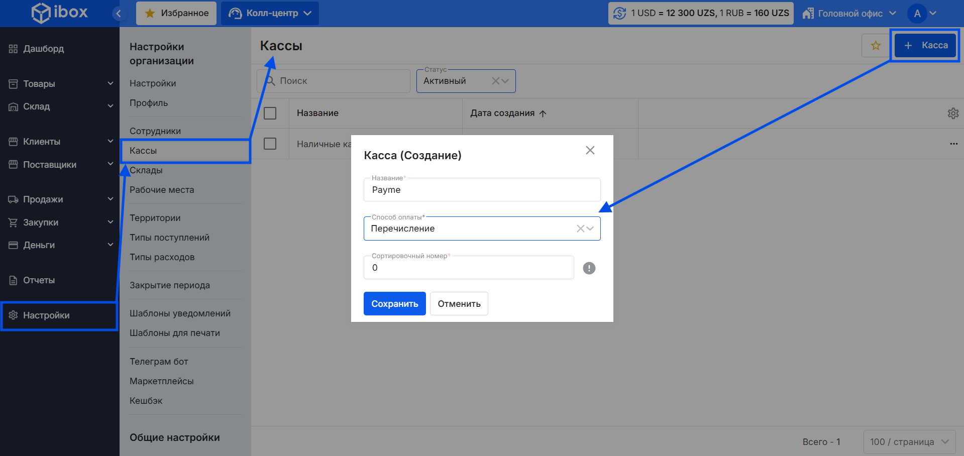 Теперь можно добавить объекты, с которыми будете работать каждый день: кассы и склады.