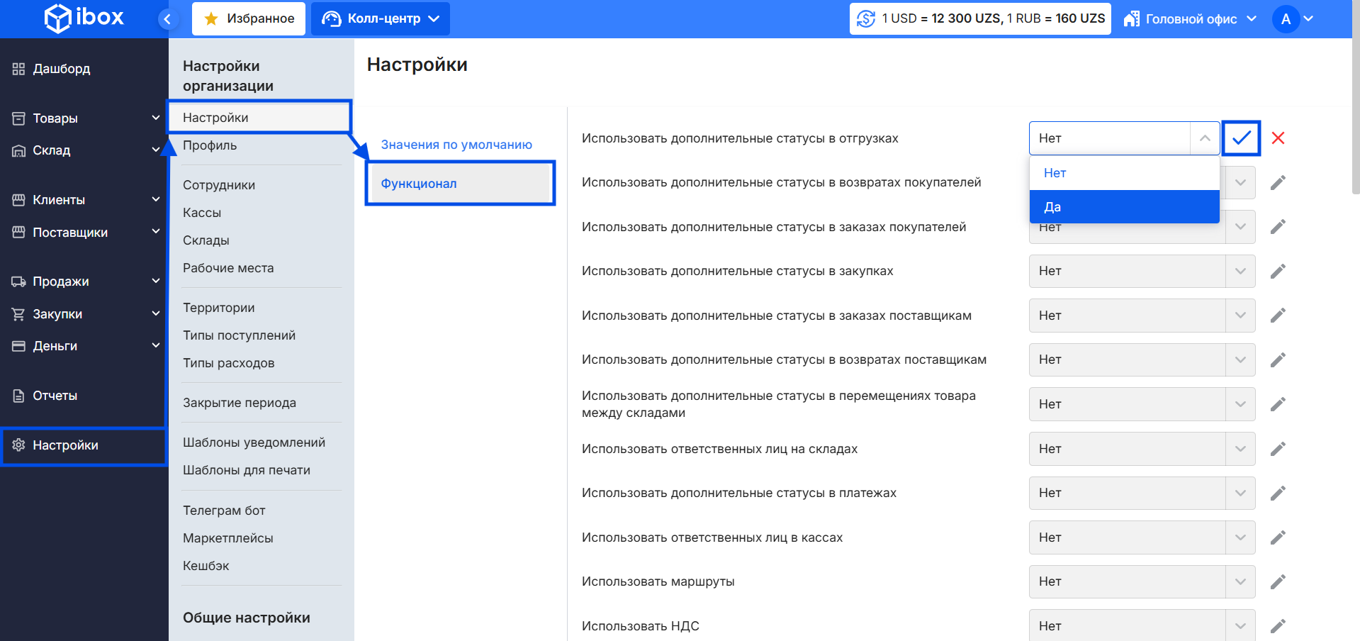 Теперь, когда кассы и склады добавлены, включим нужные функции для работы. В iBox есть гибкие настройки, которые позволяют адаптировать систему под ваш бизнес. Выберите те модули, которые пригодятся вашему бизнесу. Для этого перейдите Настройки → Функционал.