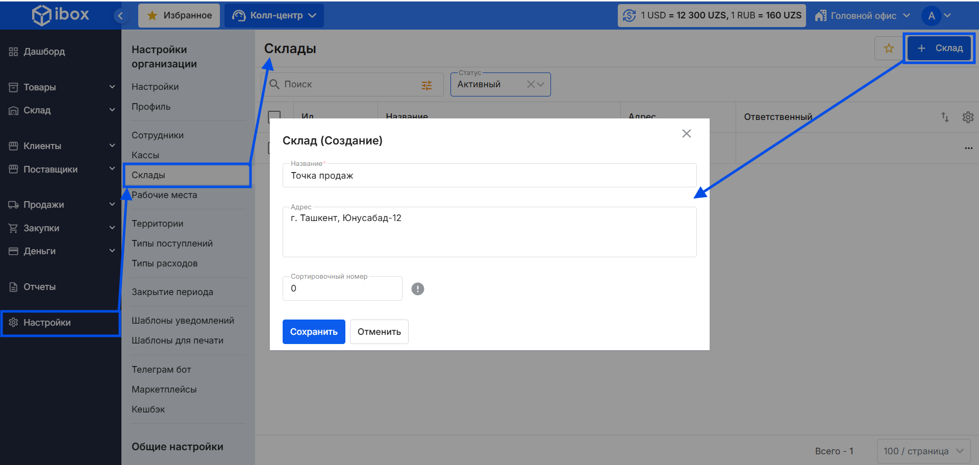 - Сортировочный номер — чем выше номер, тем выше склад будет отображаться в списке