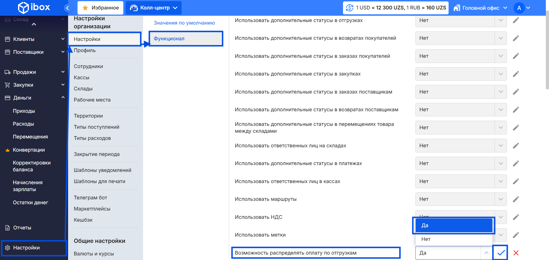 Для этого включите функцию Распределять оплаты по отгрузкам в разделе Настройки → Функционал.