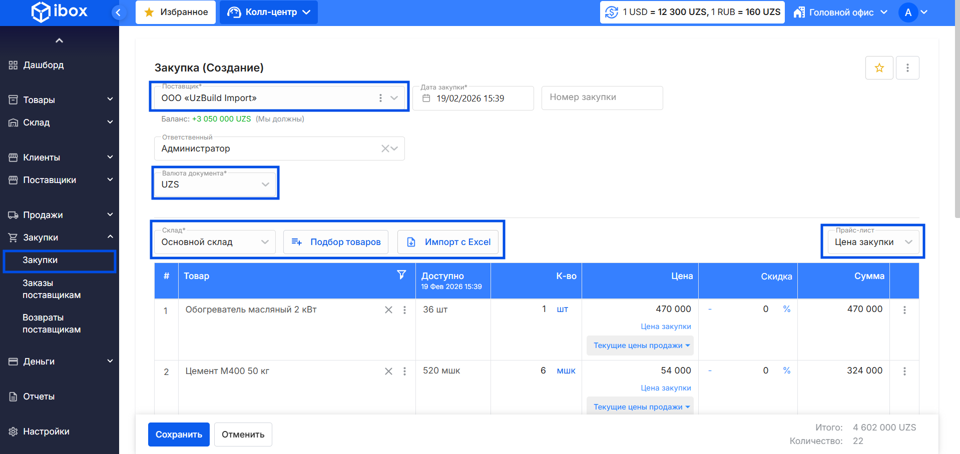 Закупка используется, когда вы приобретаете товары у поставщика и хотите учитывать взаиморасчеты.