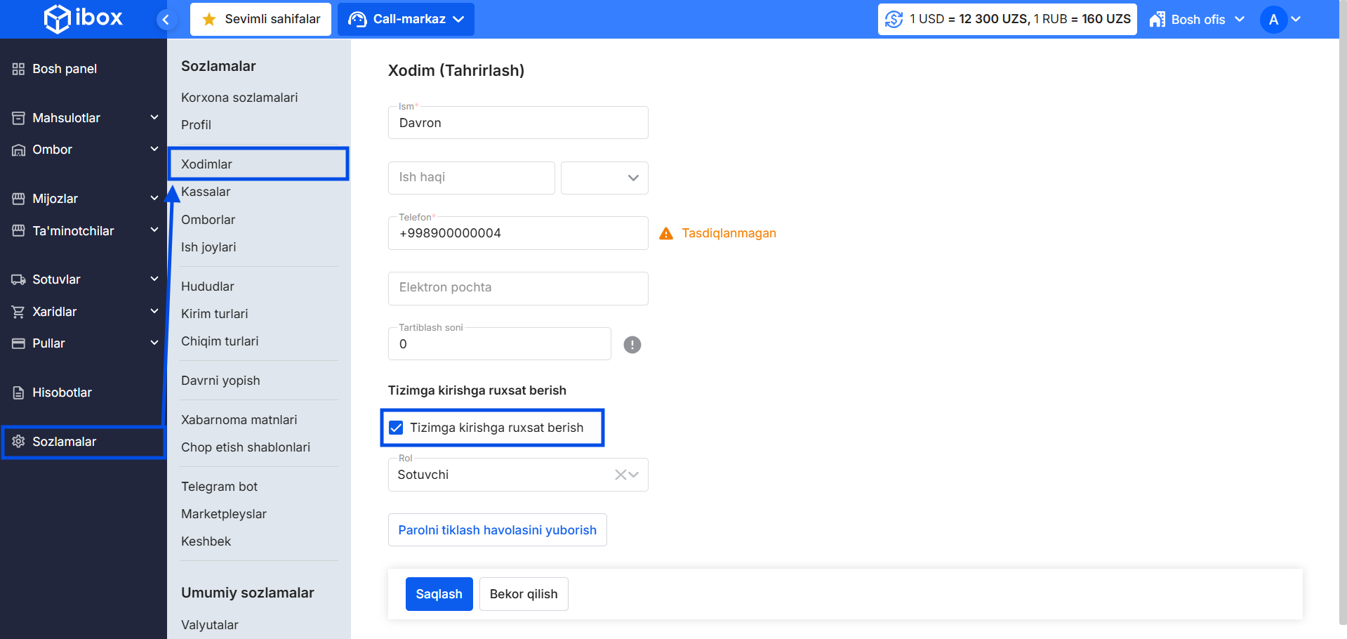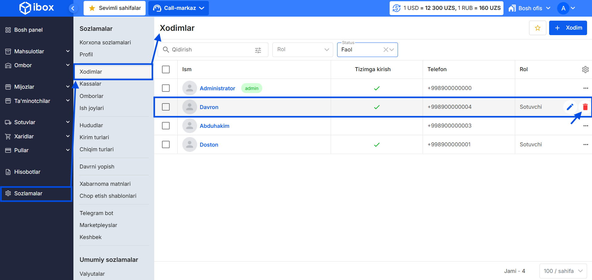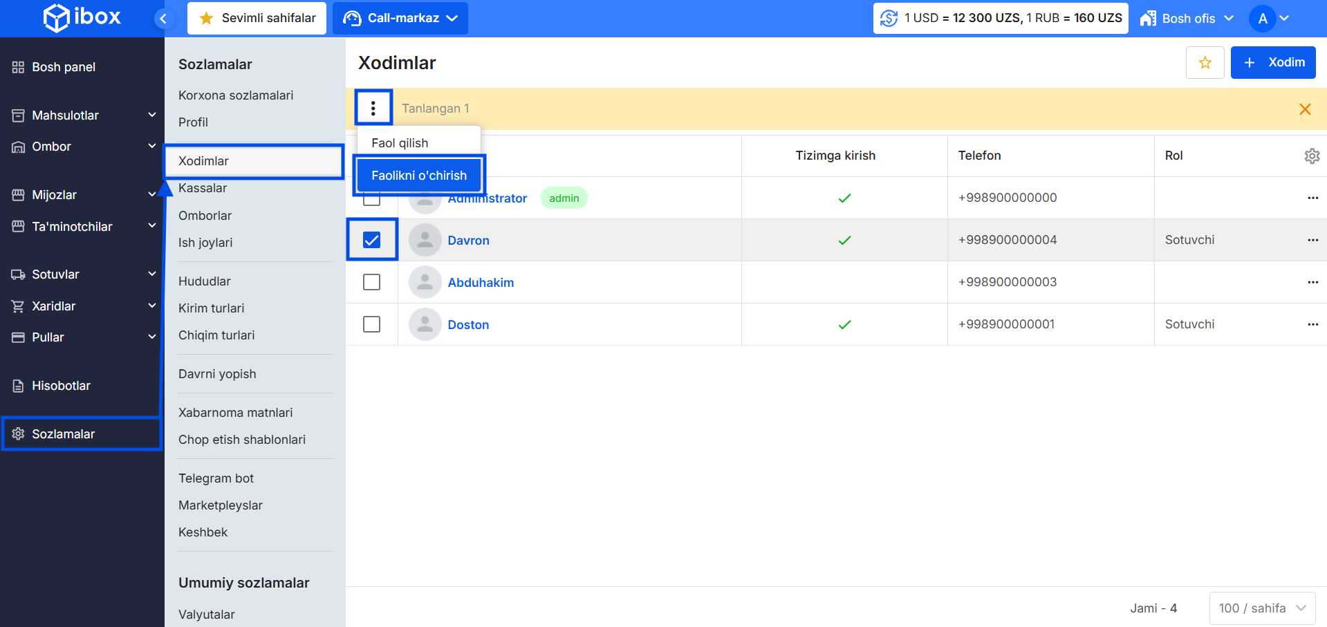 - Sozlamalar → Xodimlar bo‘limini oching