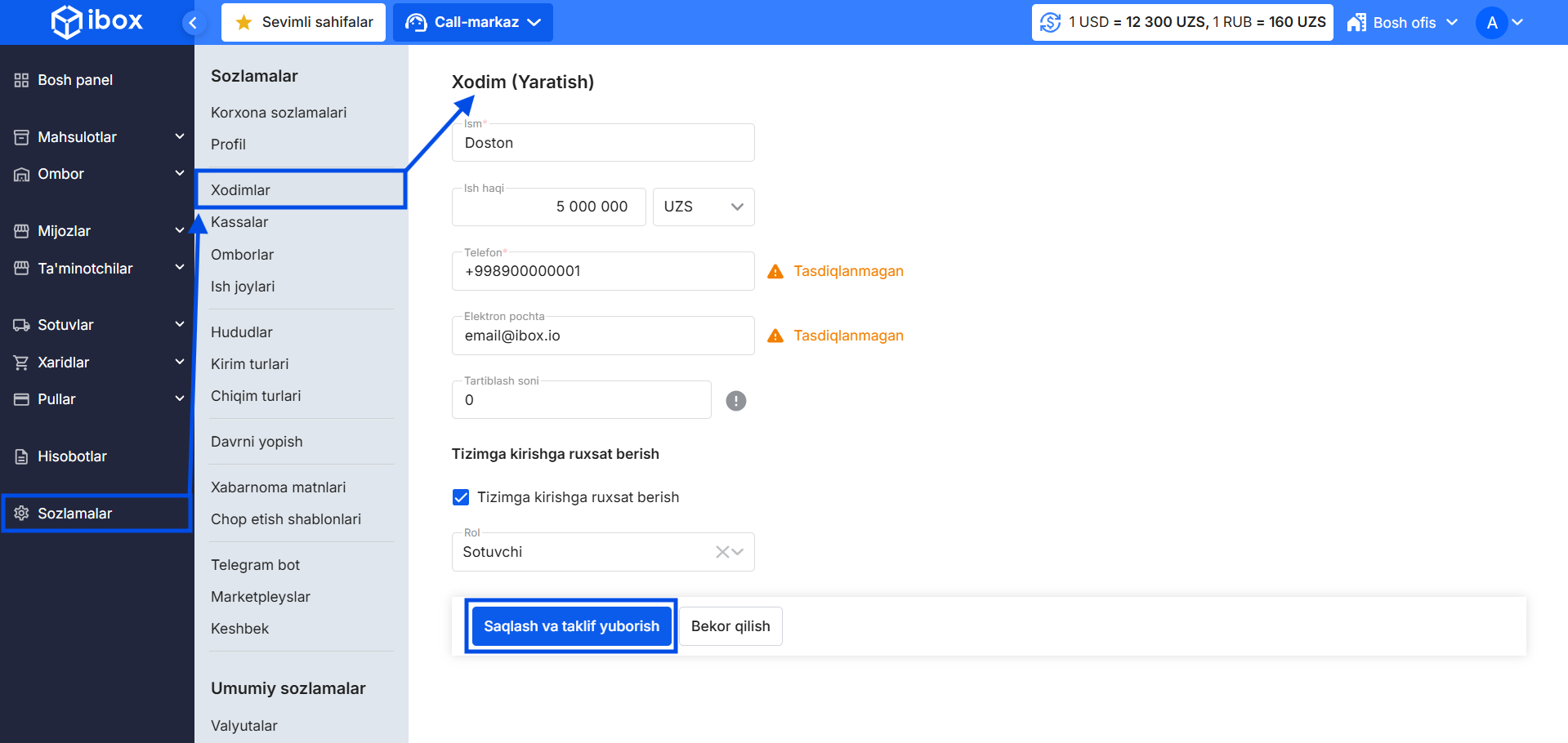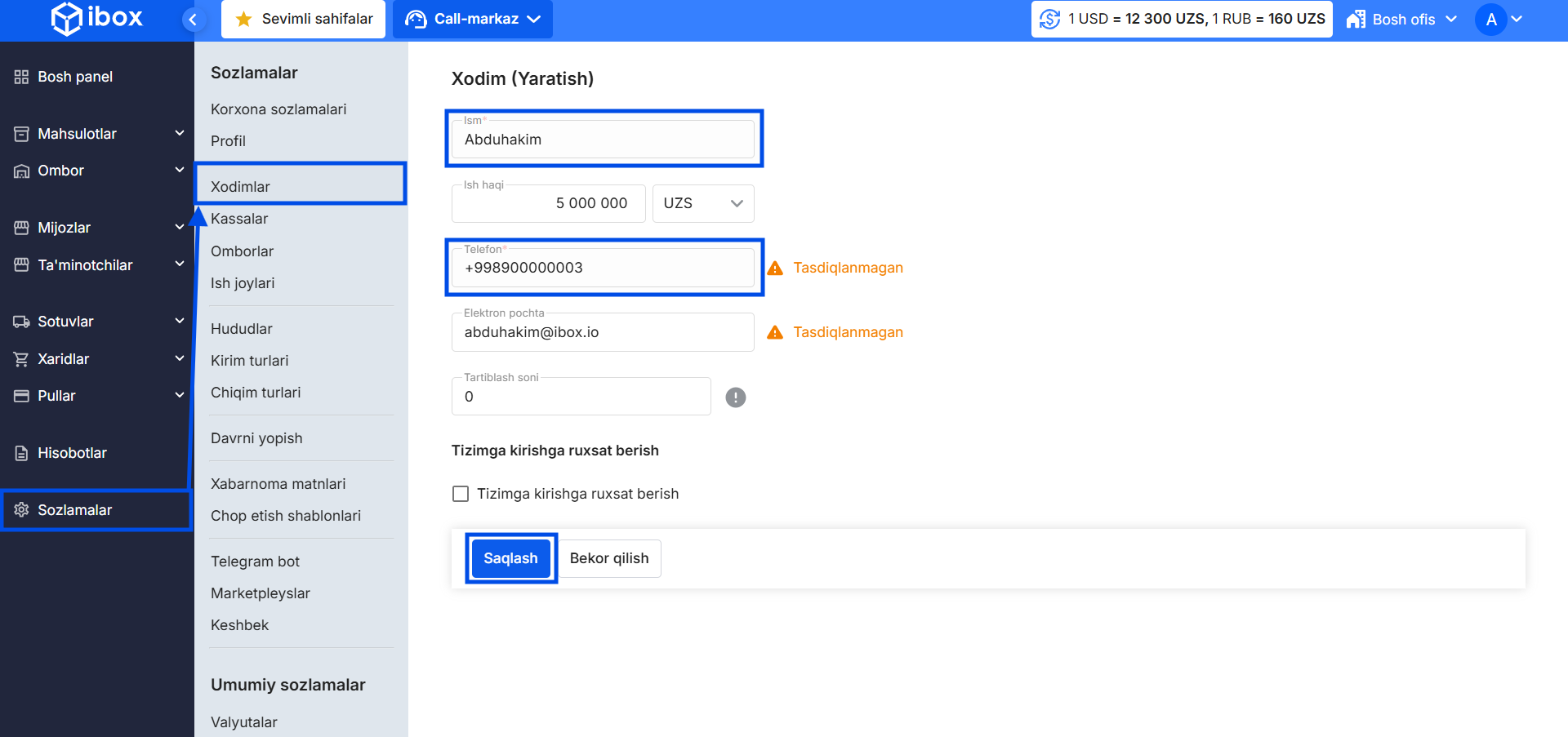 iBox’da tizimda ishlaydigan xodimlarni ham, faqat hisob-kitob uchun kerak bo‘lgan xodimlarni ham qo‘shish mumkin. Amal tartibi xodim tizimga kiradimi yoki yo‘qmi — shunga bog‘liq.