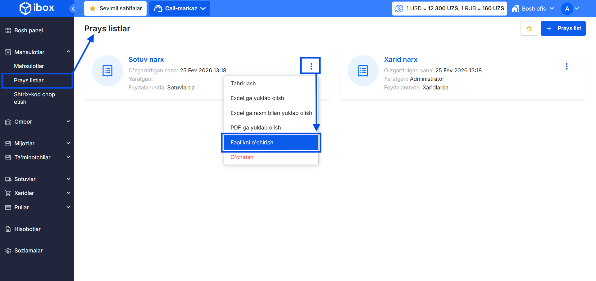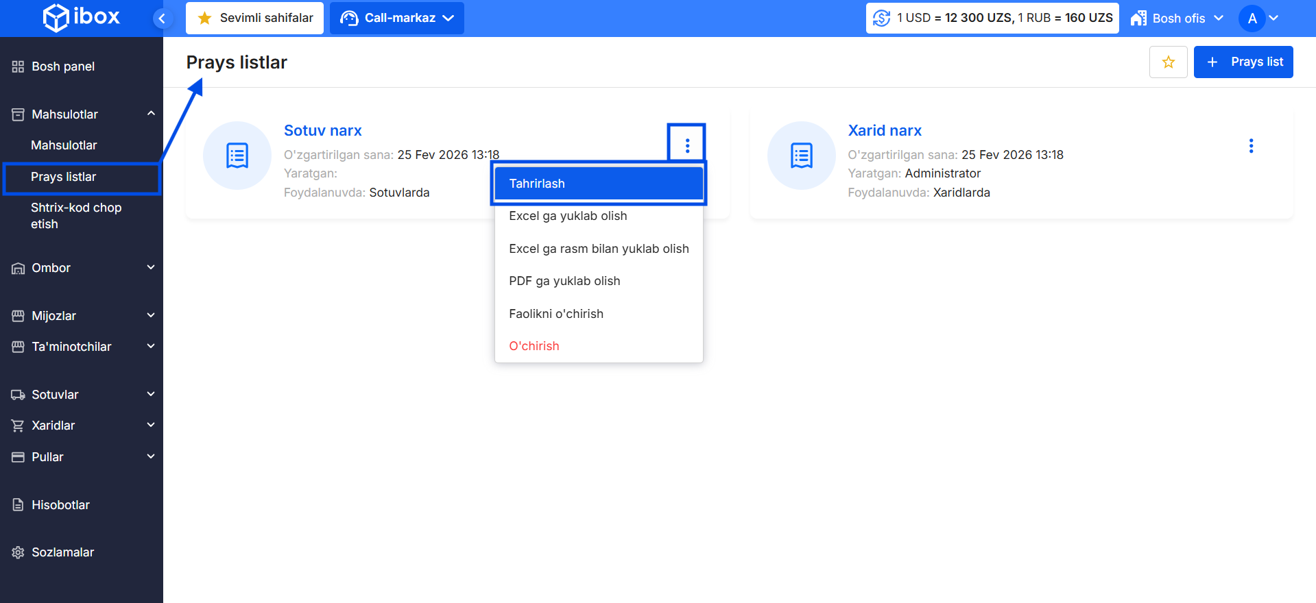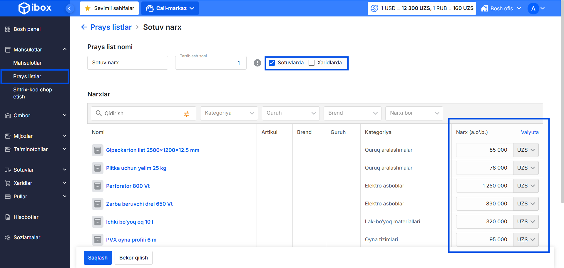iBox tizimida prays-listlar narx siyosatini moslashuvchan boshqarishga yordam beradi.