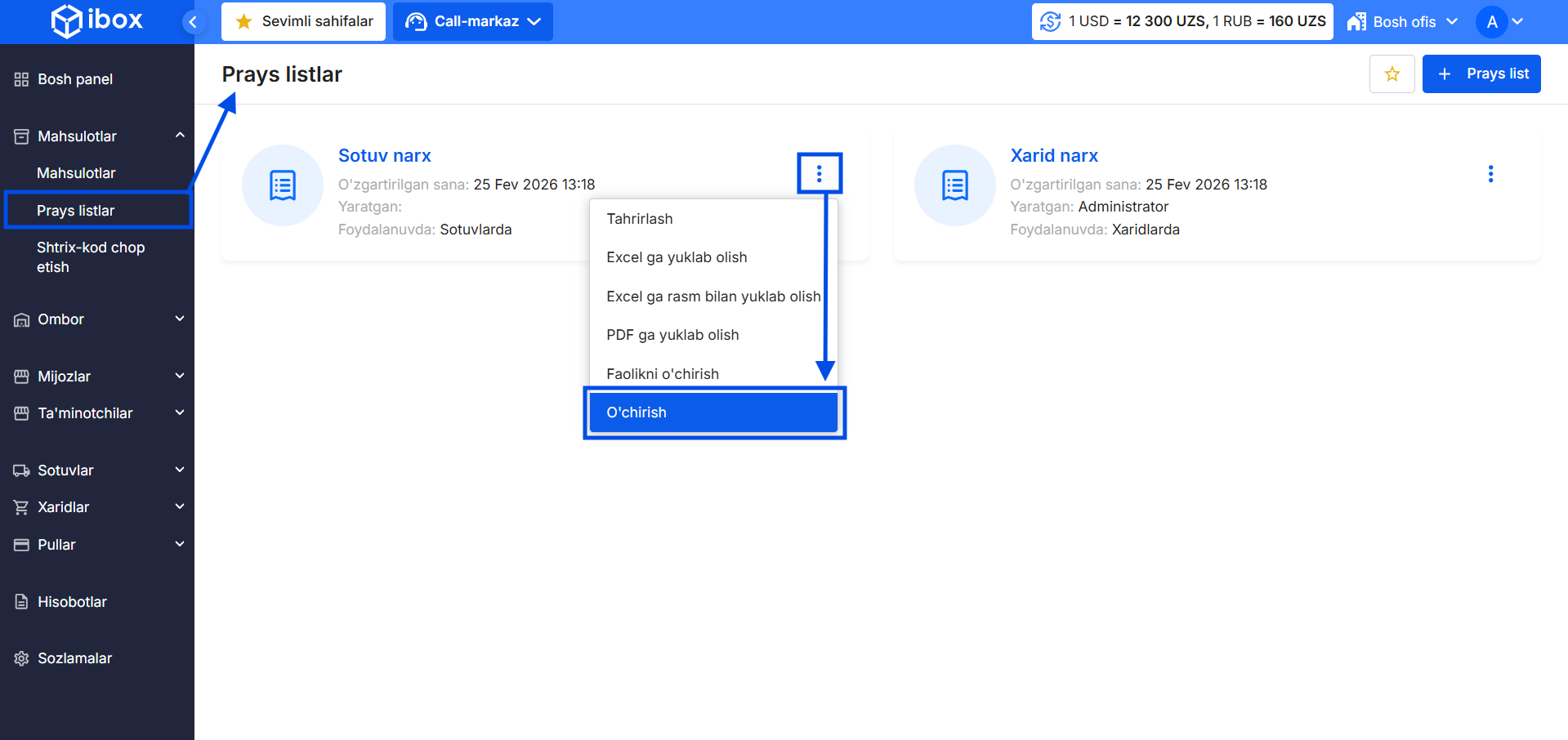 - Mahsulotlar modulidagi Prays-listlar bo‘limiga o‘ting.