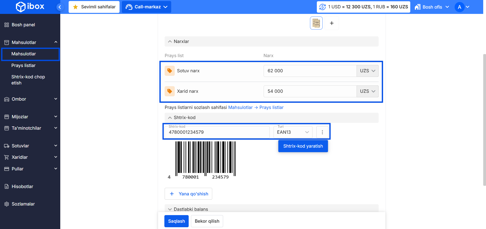 - Mahsulotlar moduliga o‘ting va ro‘yxatni oching.