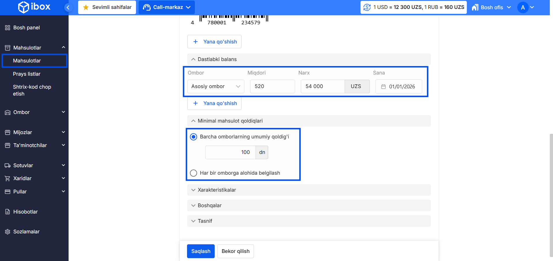 - Minimal qoldiq yorlig‘ini ochib, har bir ombor bo‘yicha yoki umumiy qoldiq uchun minimal miqdorni belgilang.