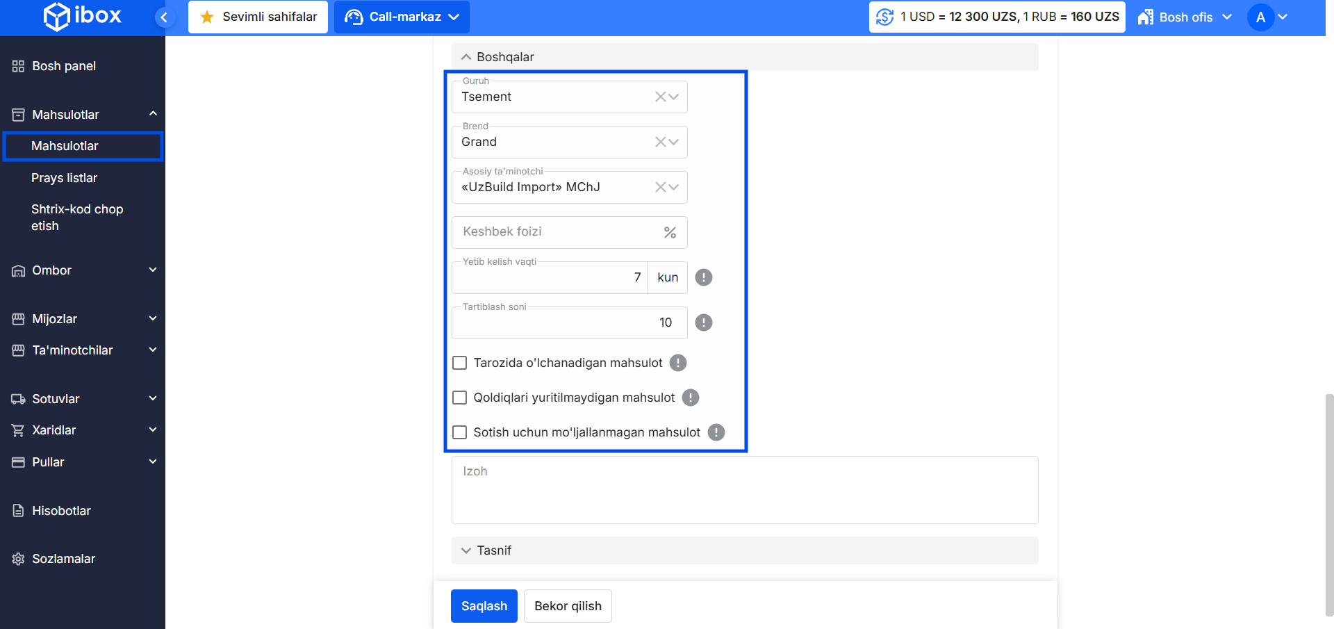 - Yon menyudan Mahsulotlar bo‘limiga o‘ting.
