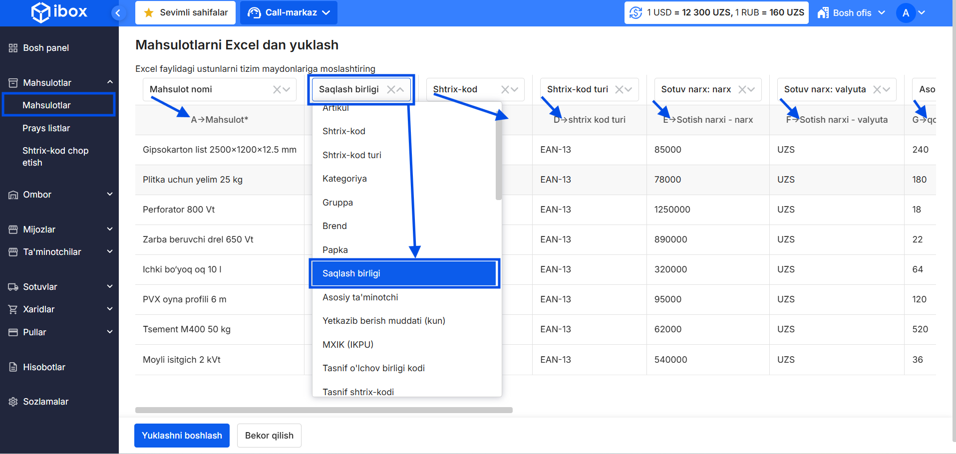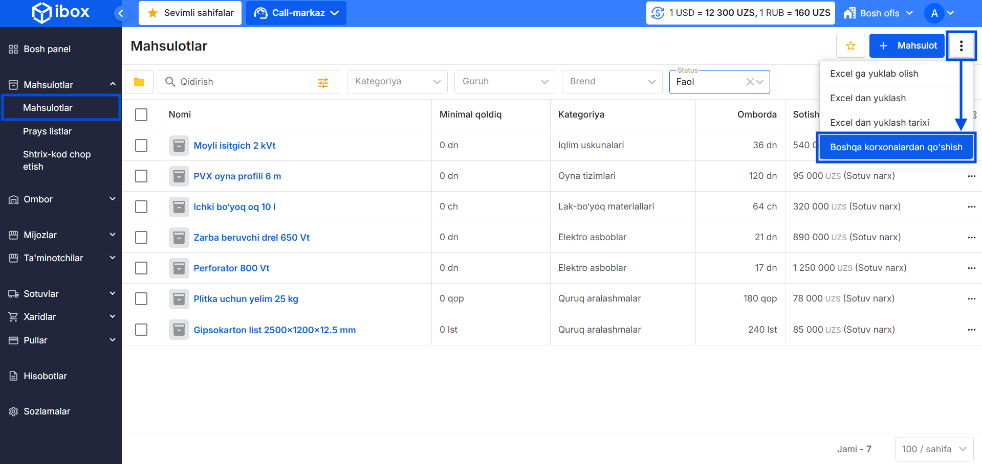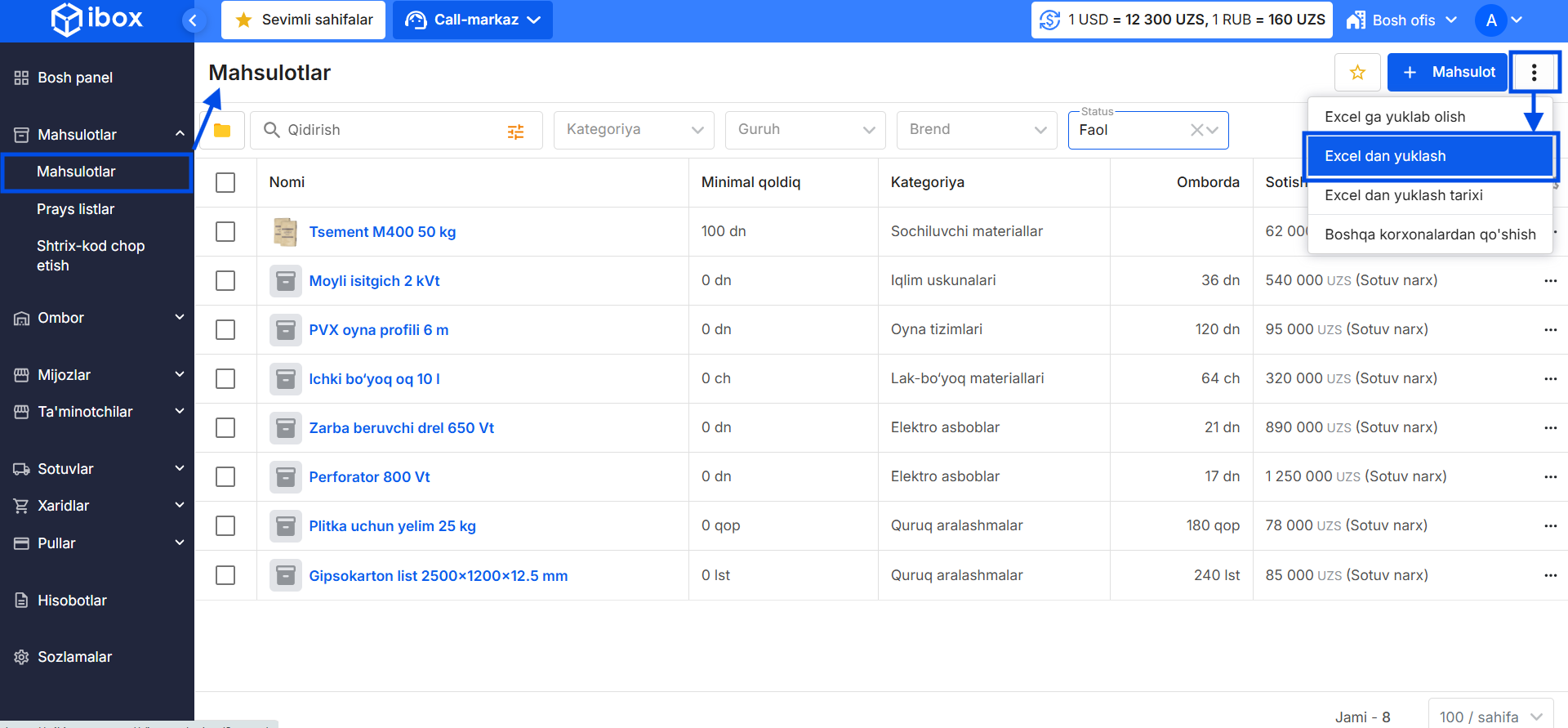 Agar sizda mahsulotlar ro‘yxati allaqachon mavjud bo‘lsa, uni tizimga yuklashingiz mumkin.