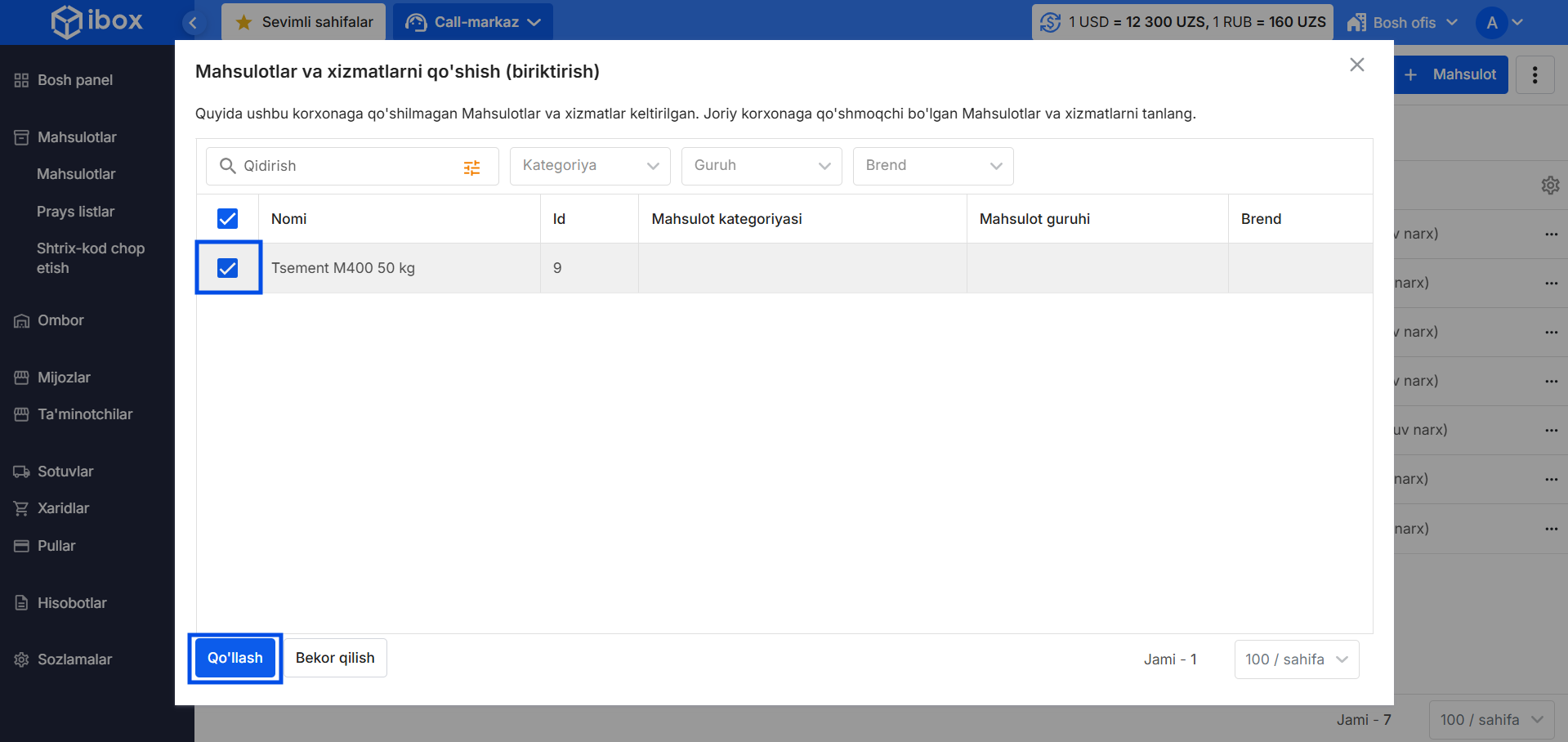 - Mahsulot va xizmatlarni qo‘shish (biriktirish) oynasida kerakli mahsulotlarni tanlang.