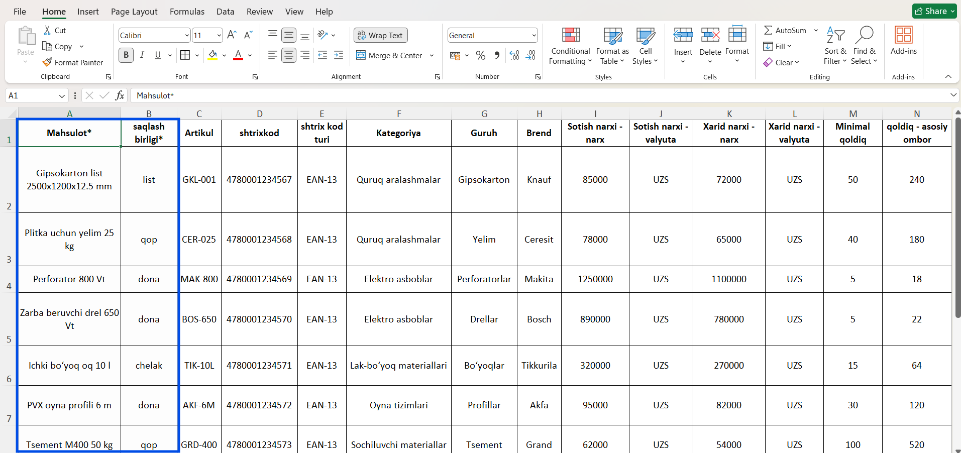 Excel faylidagi kategoriyalar, guruhlar, brendlar va valyutalar tizimdagi ma’lumotlar bilan mos bo‘lishi kerak.