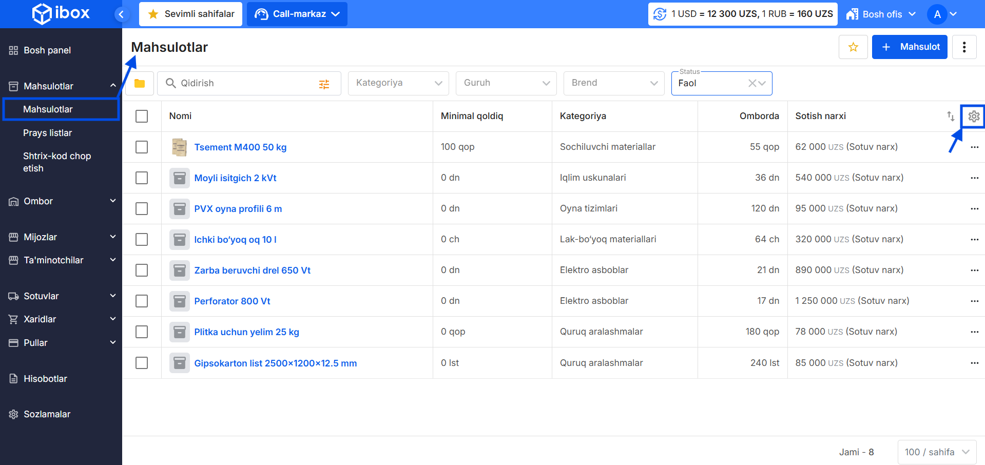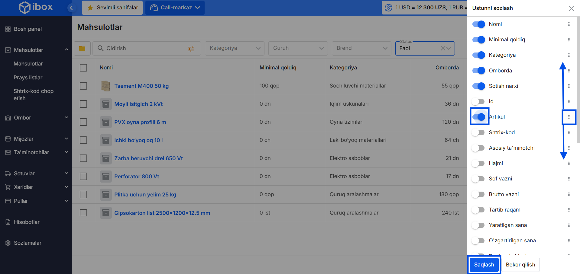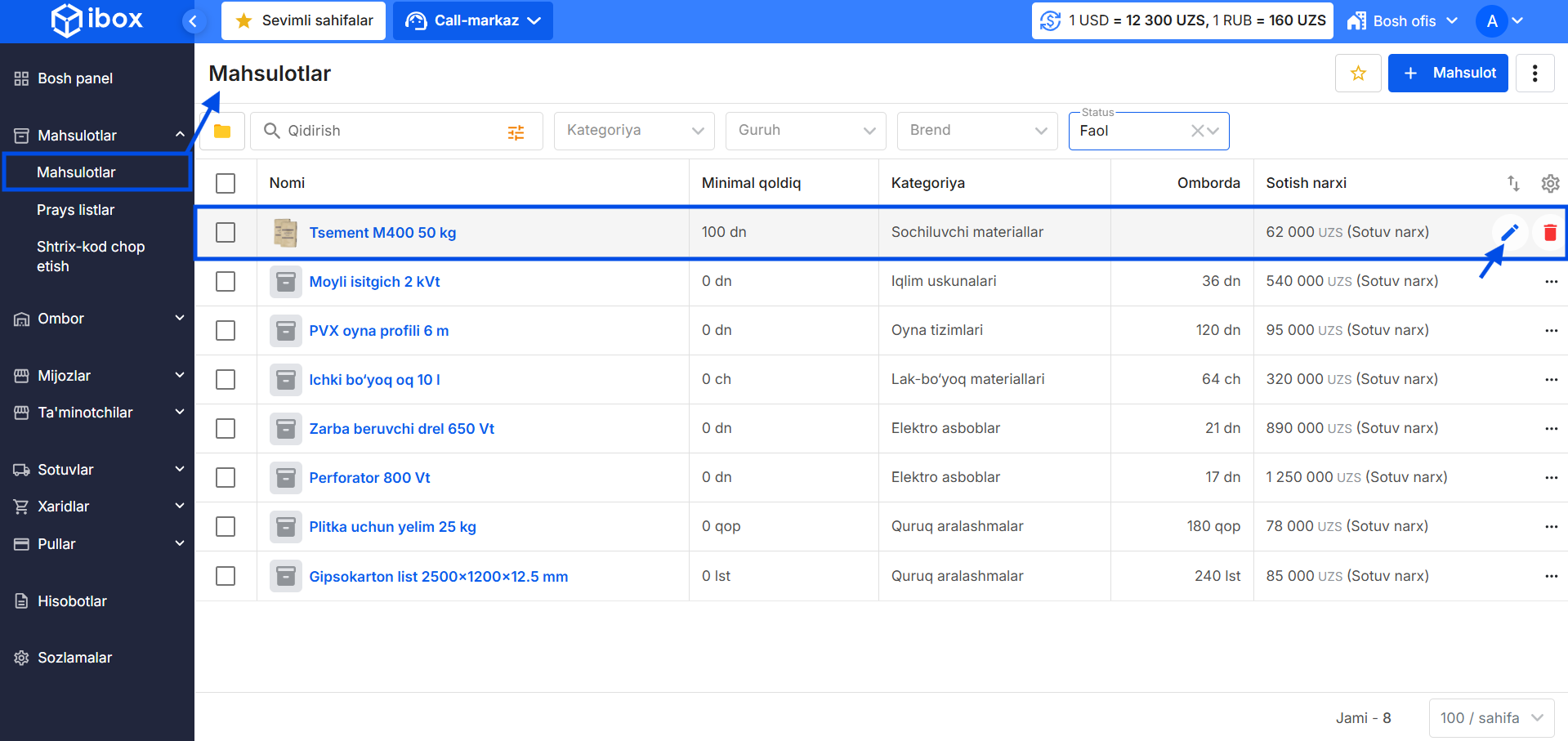 Mahsulotlarni boshqarish: tahrirlash, qoldiqlar va harakatlar