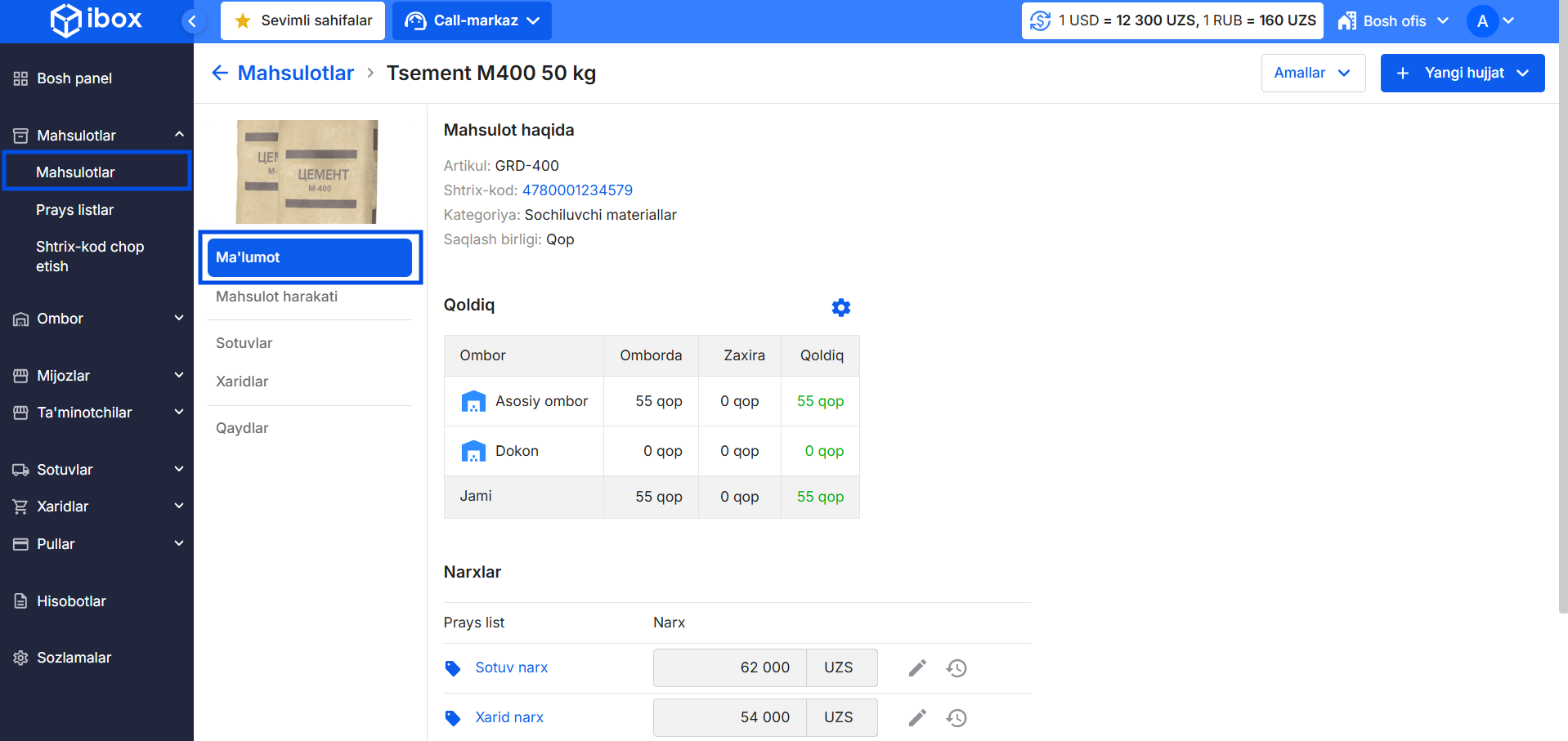 - Mahsulot haqqida ma'lumot ochiladi — unda umumiy ma’lumotlar va omborlar bo‘yicha qoldiqlar ko‘rsatiladi.