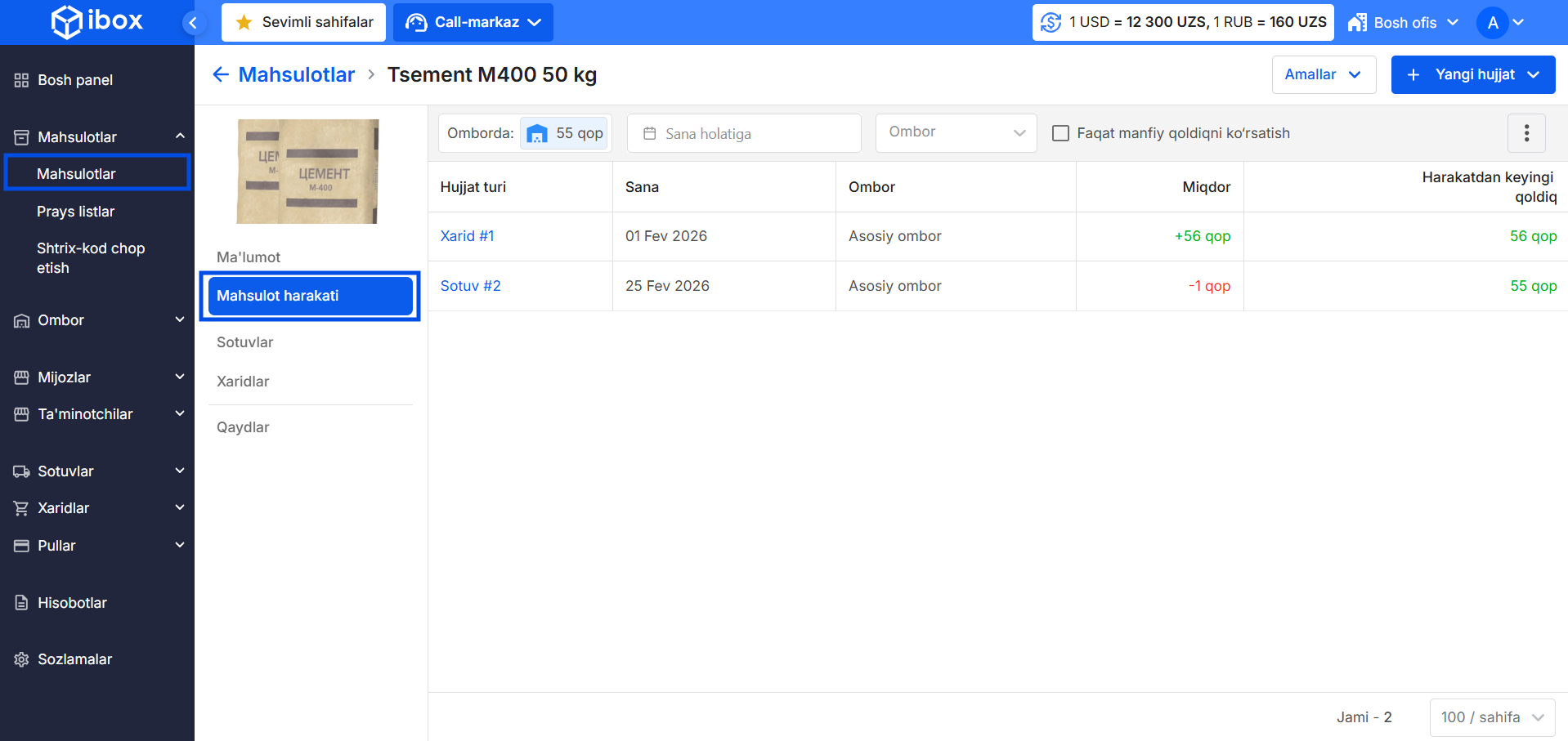 iBox tizimida siz istalgan vaqtda mahsulotni tahrirlashingiz, uning qoldiqlarini tekshirishingiz va barcha harakatlar tarixini ko‘rishingiz mumkin. Bu ma’lumotlarda tartibni saqlashga va omborni nazorat qilishga yordam beradi.