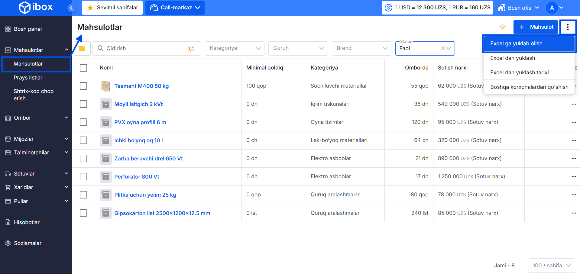 Mahsulotlar ro‘yxatini Excel’ga eksport qilish