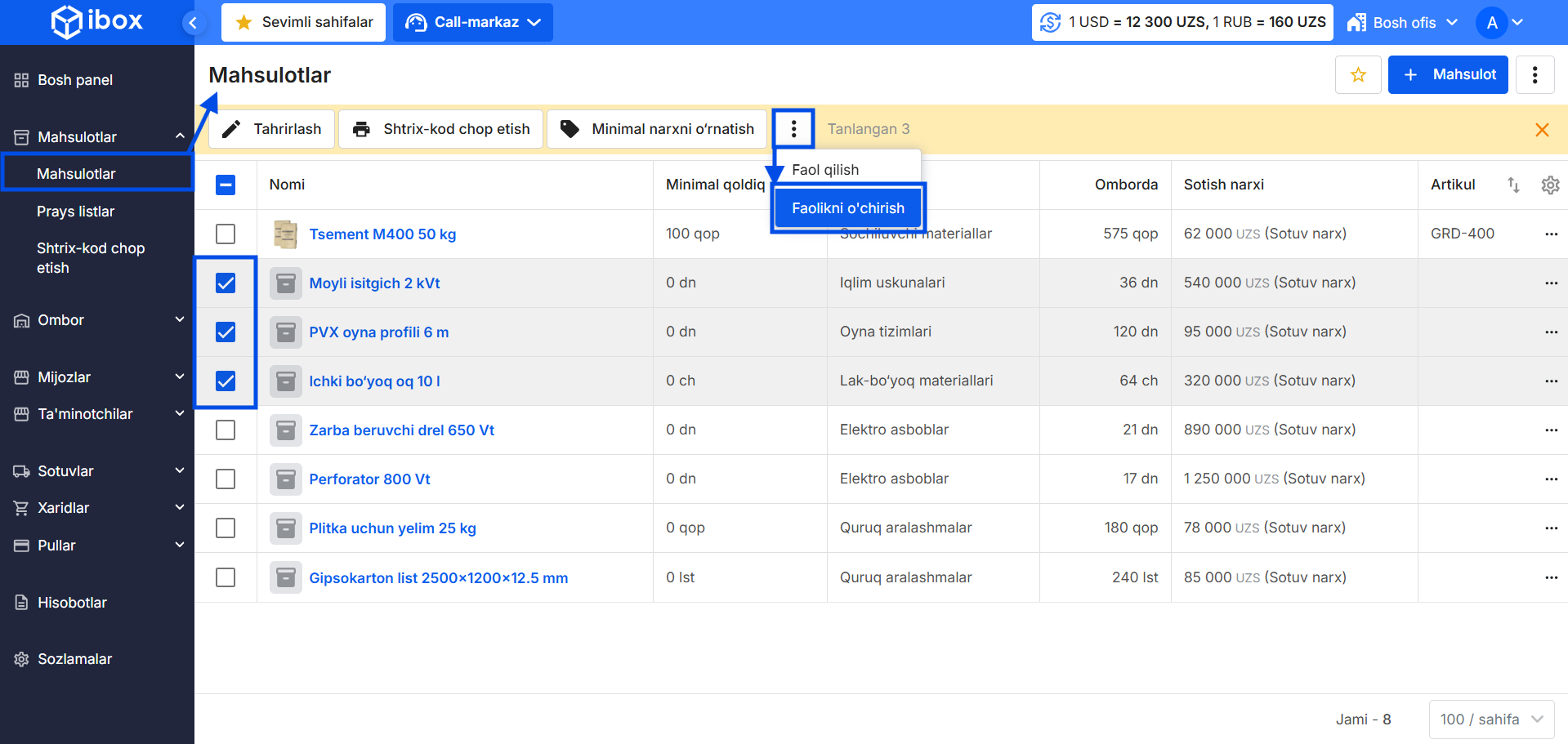 iBox tizimida mahsulotni ish jarayonidan chiqarishning aosiy ikki yo‘li mavjud: uni o‘chirish yoki faolligini o'chirish.