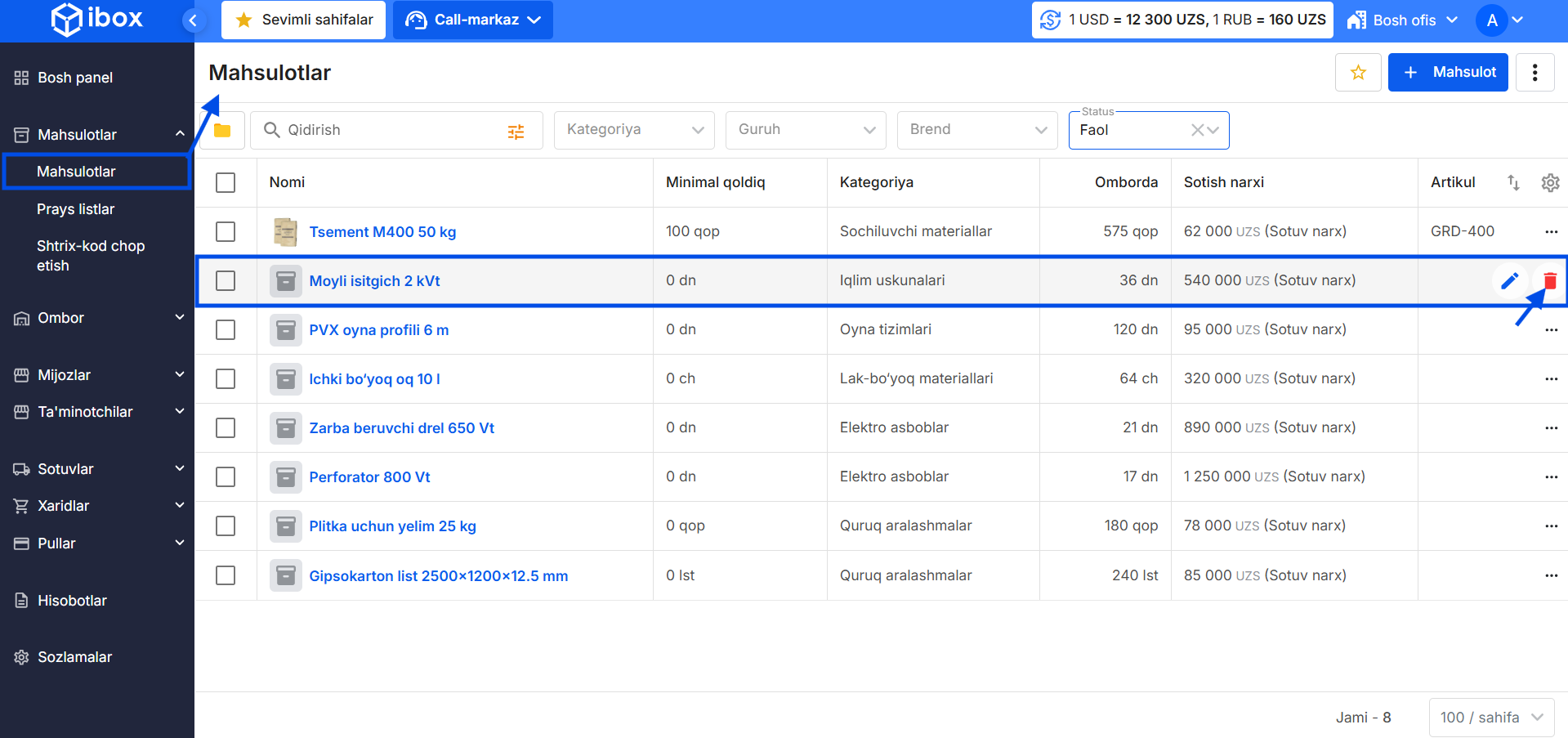 Agar mahsulotda allaqachon harakat mavjud bo‘lsa (xaridlar, sotuvlar, ko‘chirishlar), tizim uni o‘chirishga ruxsat bermaydi. Harakatlarni o'chirish hisobotlarda xatolarga olib kelishi mumkin.