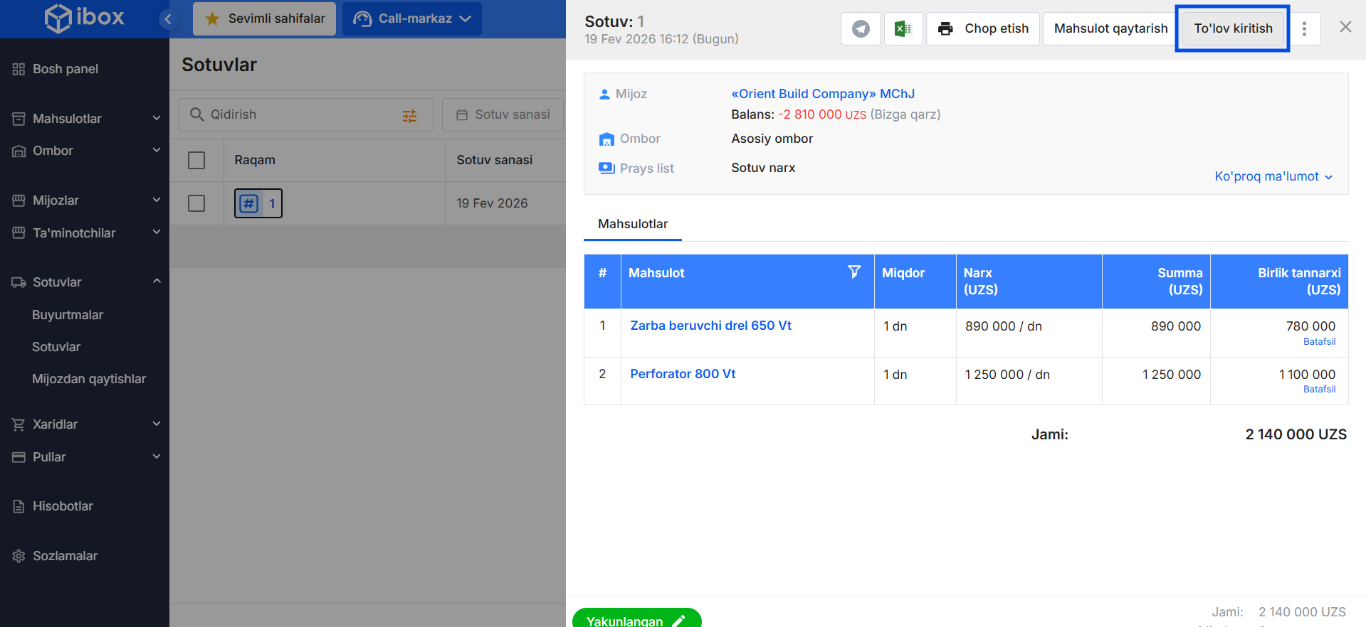 - Sotuv ma’lumotlarini to‘ldiring — mijoz, mahsulotlar, narxlar.