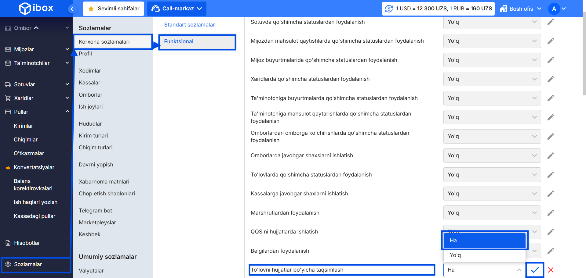 Buning uchun Sozlamalar → Funksional bo‘limida To‘lovni hujjatlar bo‘yicha taqsimlash funksiyasini yoqing.