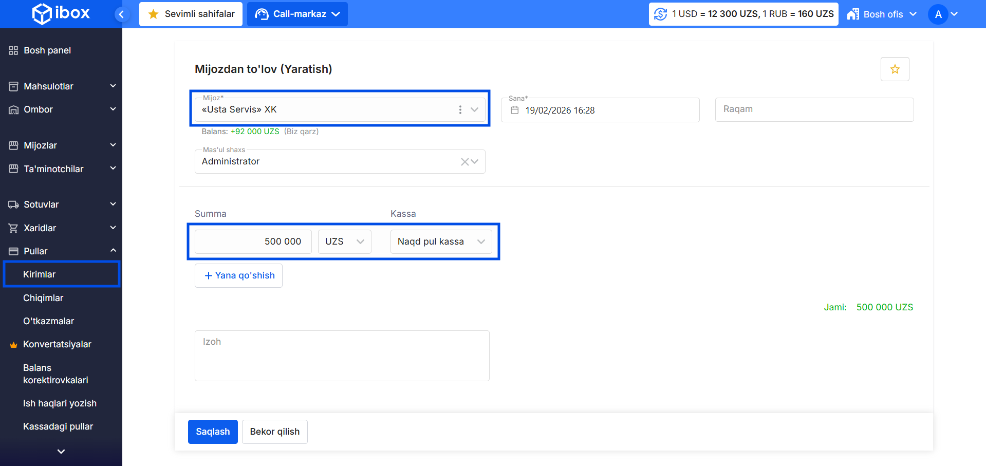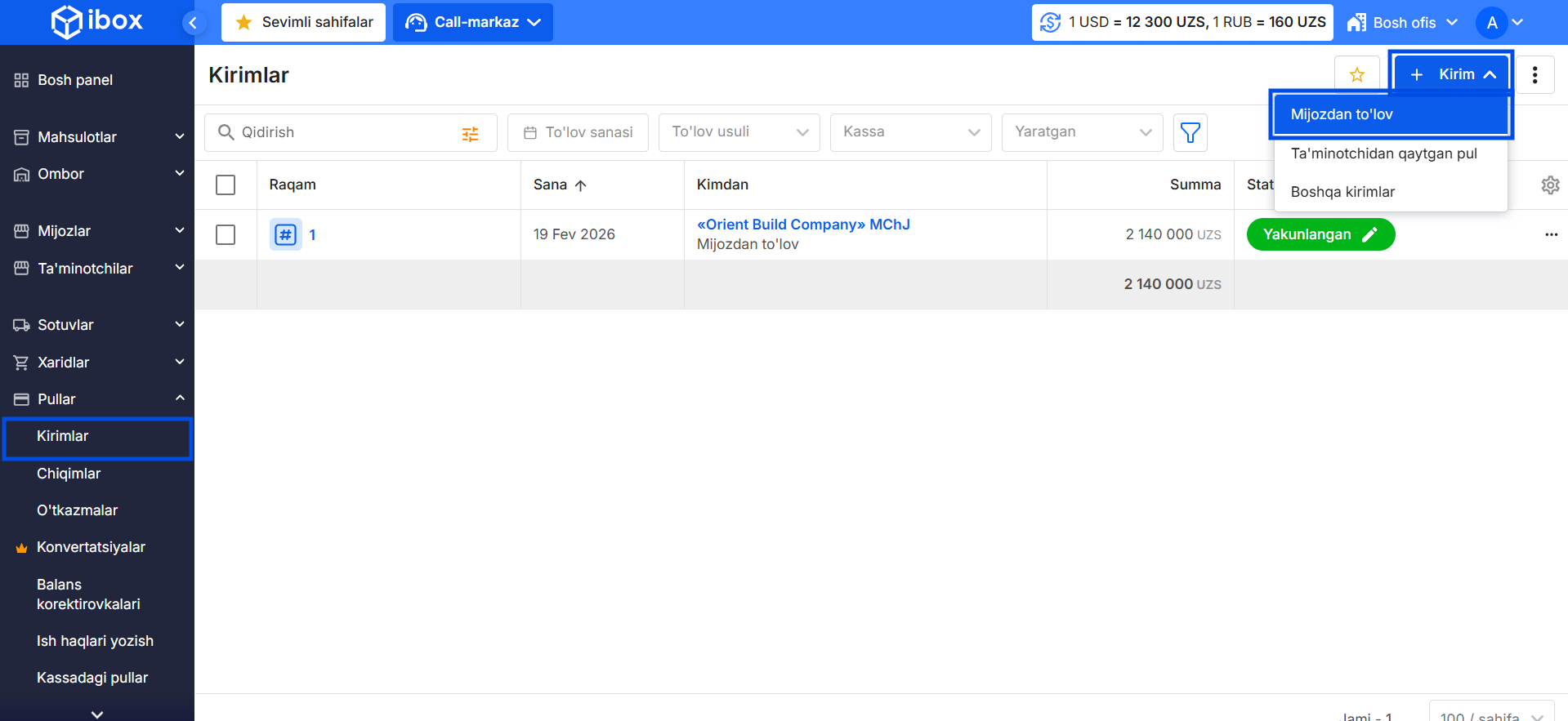 - Pullar → Kirimlar bo‘limiga o‘ting.
