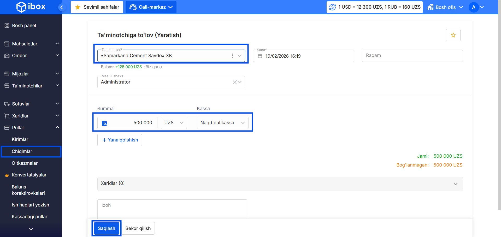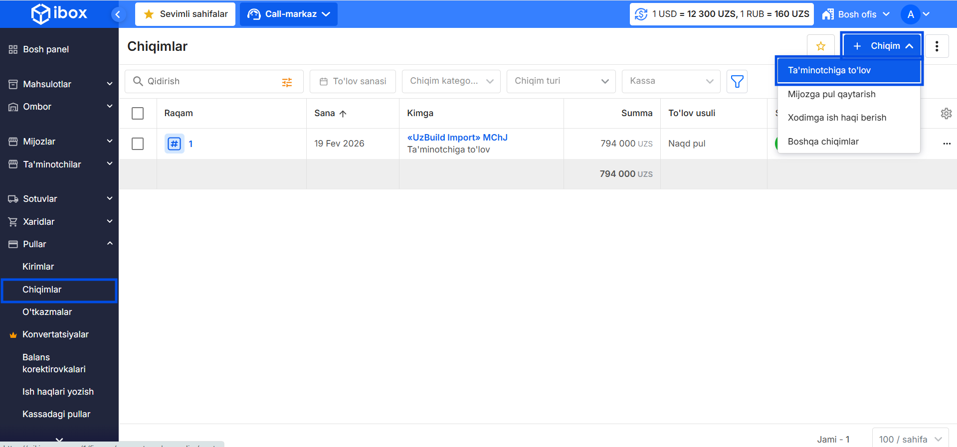 - Pullar → Chiqimlar bo‘limiga o‘ting.