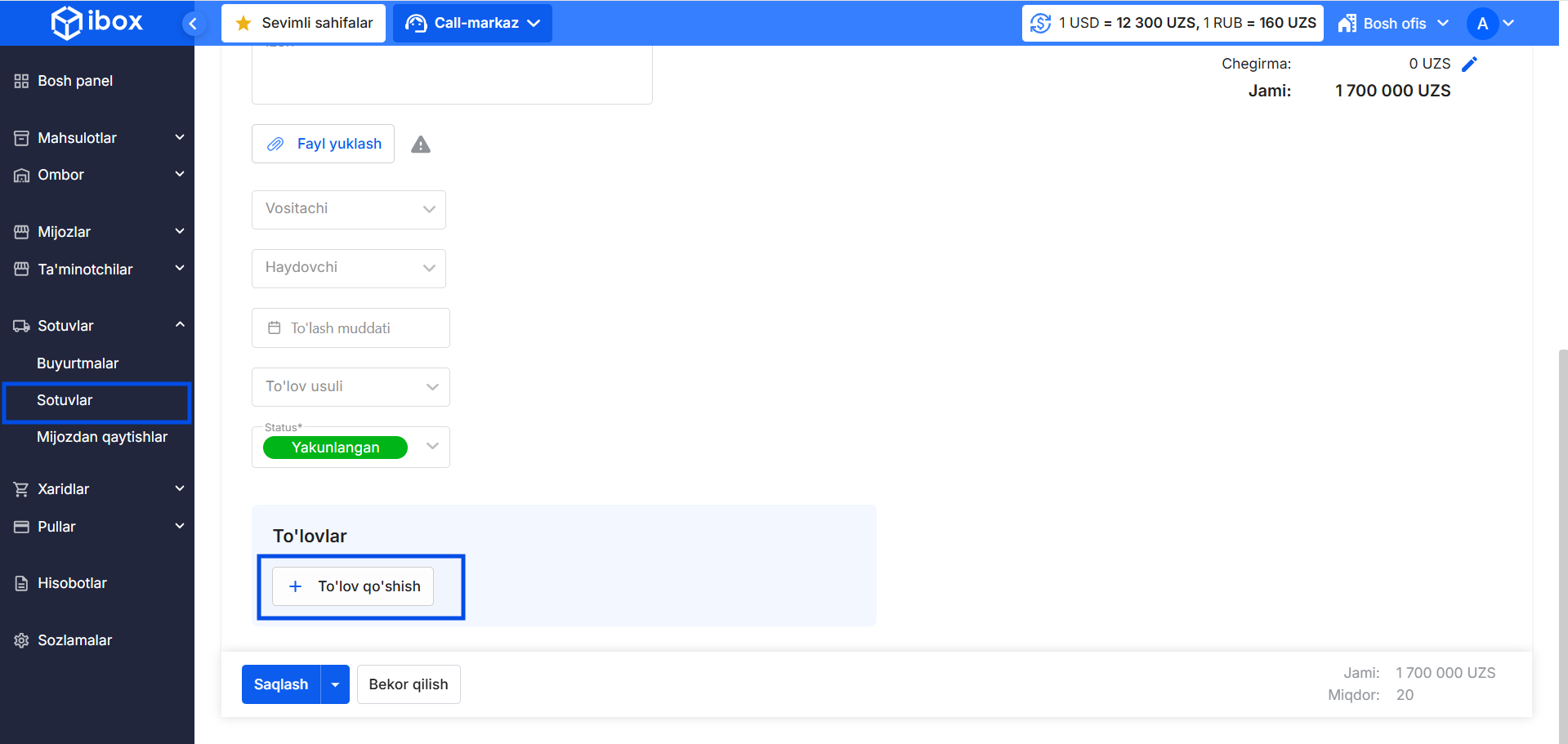 - Sotuvlar bo‘limiga o‘ting.