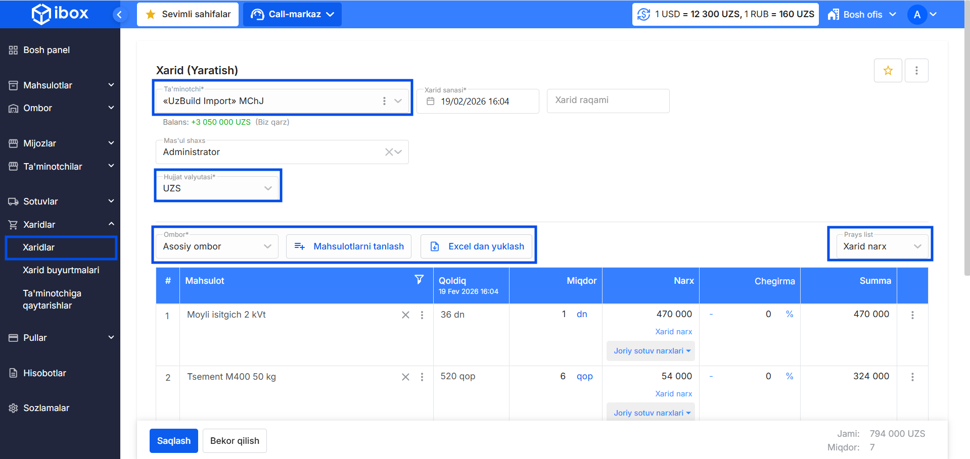 Xarid — bu siz ta'minotchidan mahsulot sotib olib, o‘zaro hisob-kitoblarni yuritmoqchi bo‘lganingizda ishlatiladi.